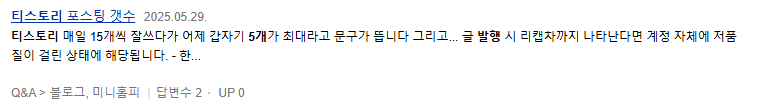 이런 변화로 인해 티스토리는 건전한 콘텐츠 생태계를 지키기 위해 하루 게시물 수를 제한하는 정책을 도입했습니다. 기존 유저는 하루 최대 30개, 신규 가입자는 하루 15개까지 글을 작성할 수 있도록 설정되었죠.