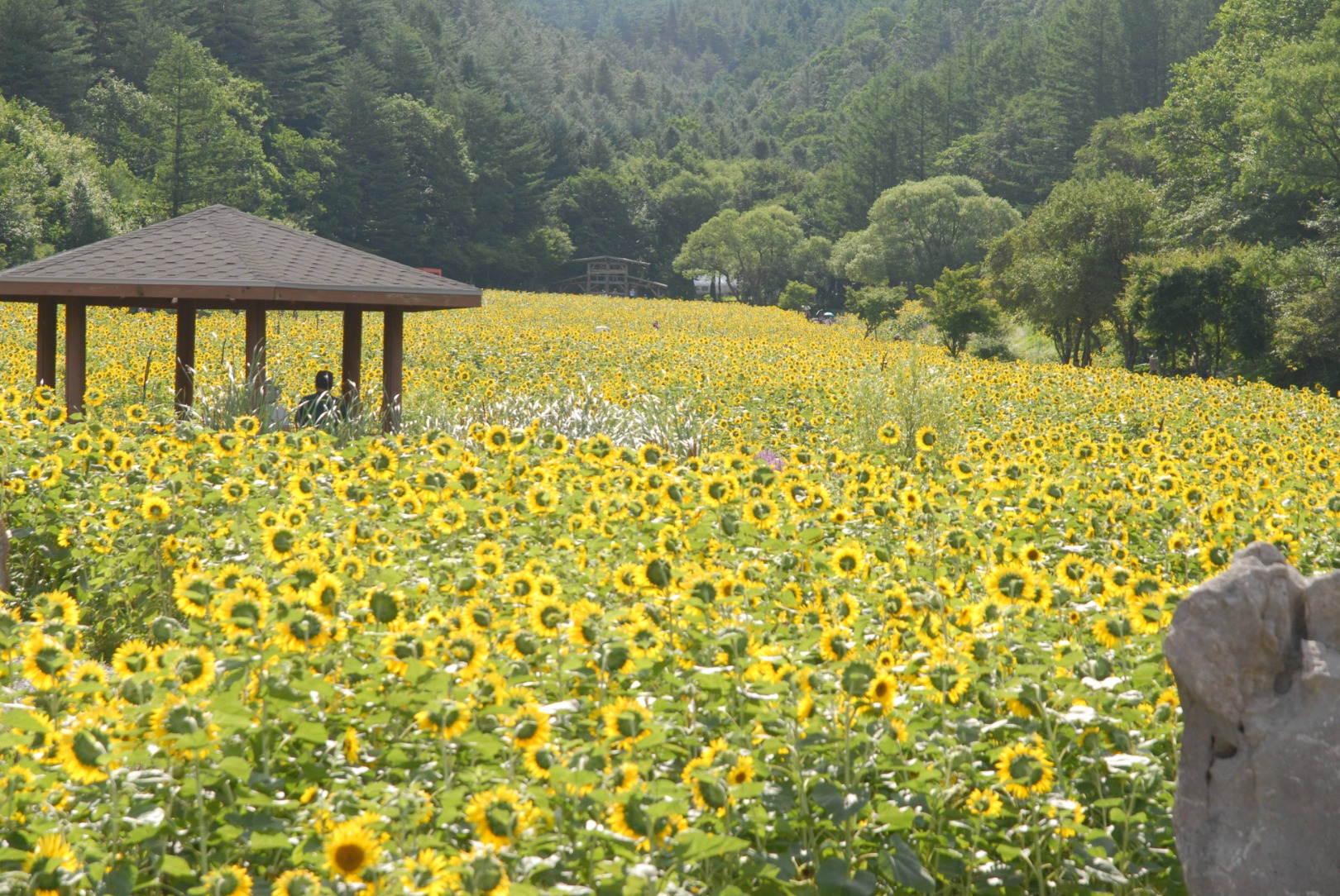 1. 황금 물결 전시관** - 100만 송이 해바라기 평원 및 코스모스 언덕 산책 - 백두대간 해발 800m 잣나무 숲 인근 자연 감상